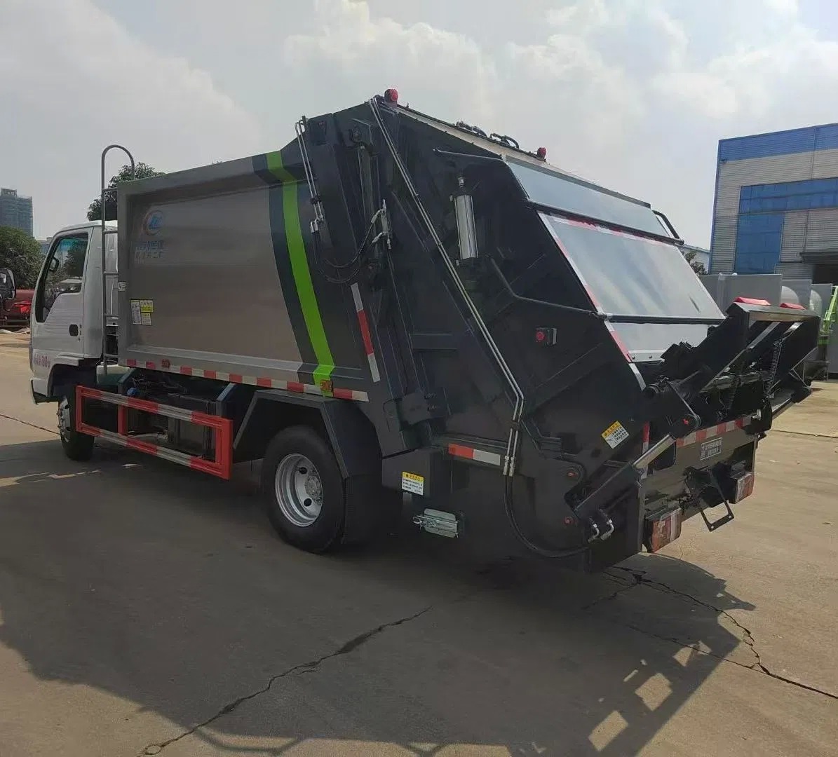The compressed garbage truck consists of a sealed garbage bin, a hydraulic system, and an operating system.