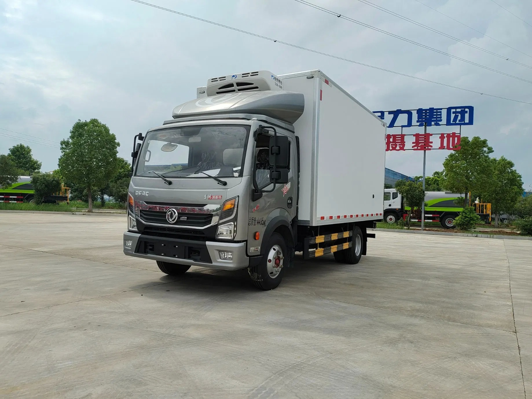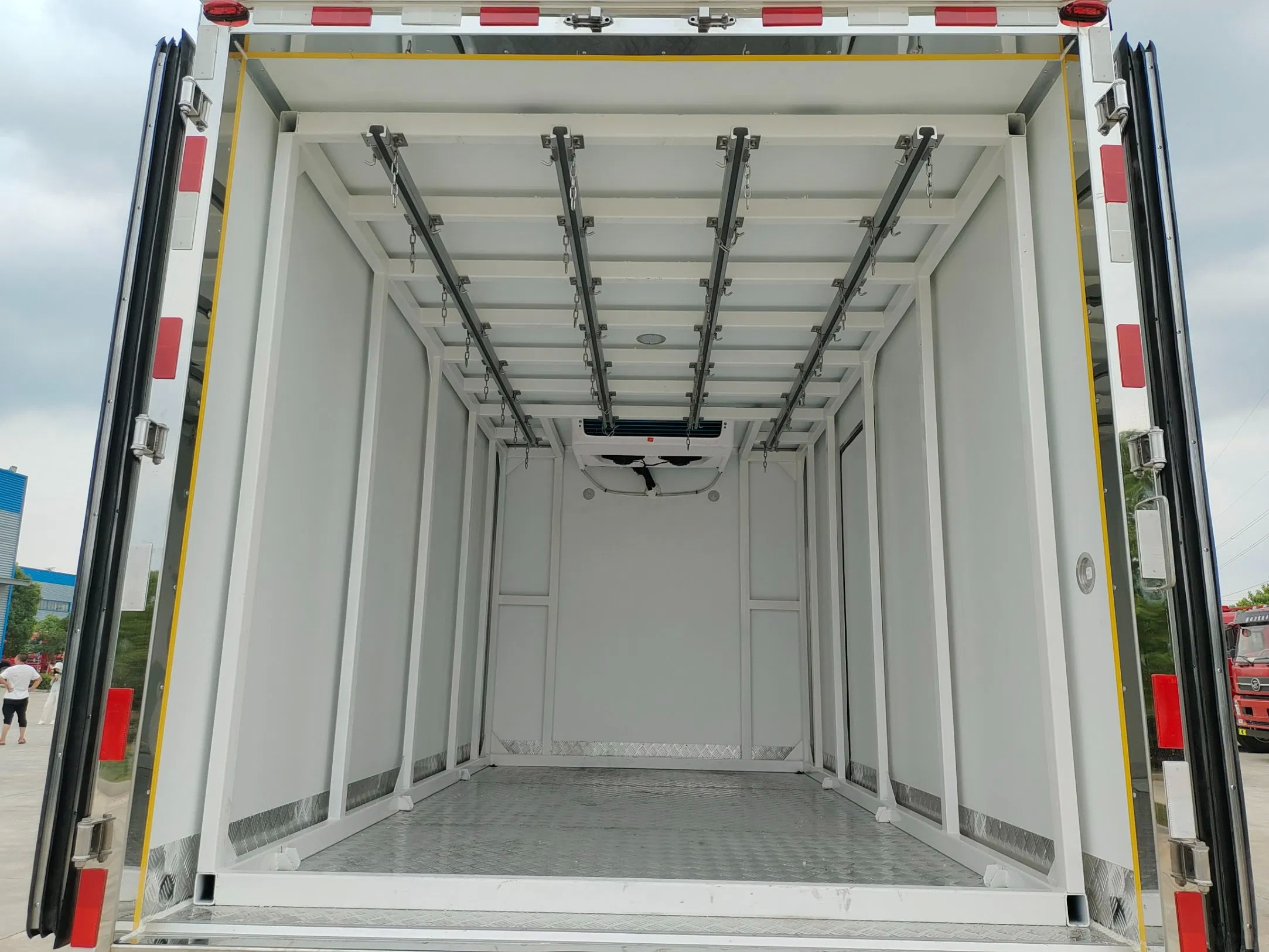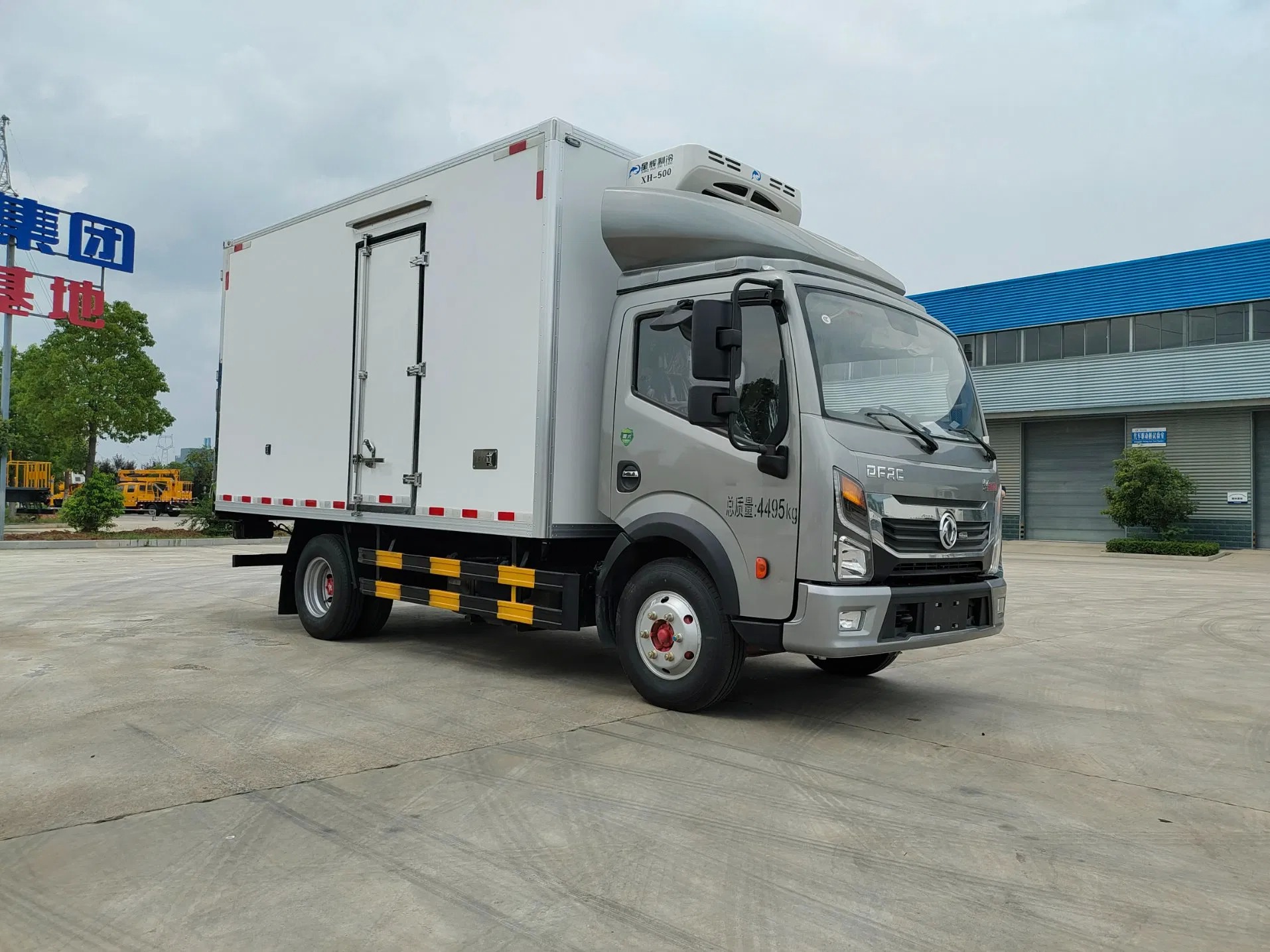 Upper configuration: 1. The refrigerated truck box body adopts the international general sandwich technology + our factory's patented wood technology (the keel connection is inlaid with environmentally friendly waterproof wood for heat preservation and corrosion resistance), broken bridge insulation technology, one-piece box body, and optional domestic Xinghui refrigeration unit. 2. The box board is made of galvanized pipe frame and environmentally friendly waterproof wood board, thickened 3.0 fiberglass, high-strength adhesive, hot pressing, the outer frame is made of 304 stainless steel, thickened aluminum profile edging, 27 stainless steel door lock, accessories, the box body is spliced without glue and no gaps, the cooling speed is fast, the heat dissipation is slow, and the insulation effect is good. The door has a bevel and a single side door. The sub-beam is folded at one time with 510 beam steel and locked with a pressure plate. The side guard net and rear bumper are formed at one time. 3. The production line of the refrigerated truck factory is the most advanced 18-meter large composite board production line in the world. The machine automatically cleans the platen table before production to ensure that the platen machine is pressed and formed in one time. Its production equipment and technology are ahead of the industry standards. The box has a beautiful appearance, light overall quality, high strength, no leakage, and the box is sturdy and durable with high insulation effect. The insulation effect reaches the national A level, and can keep warm for 8-12 hours when the refrigeration machine is not working. Refrigeration unit: Xinghui refrigeration unit